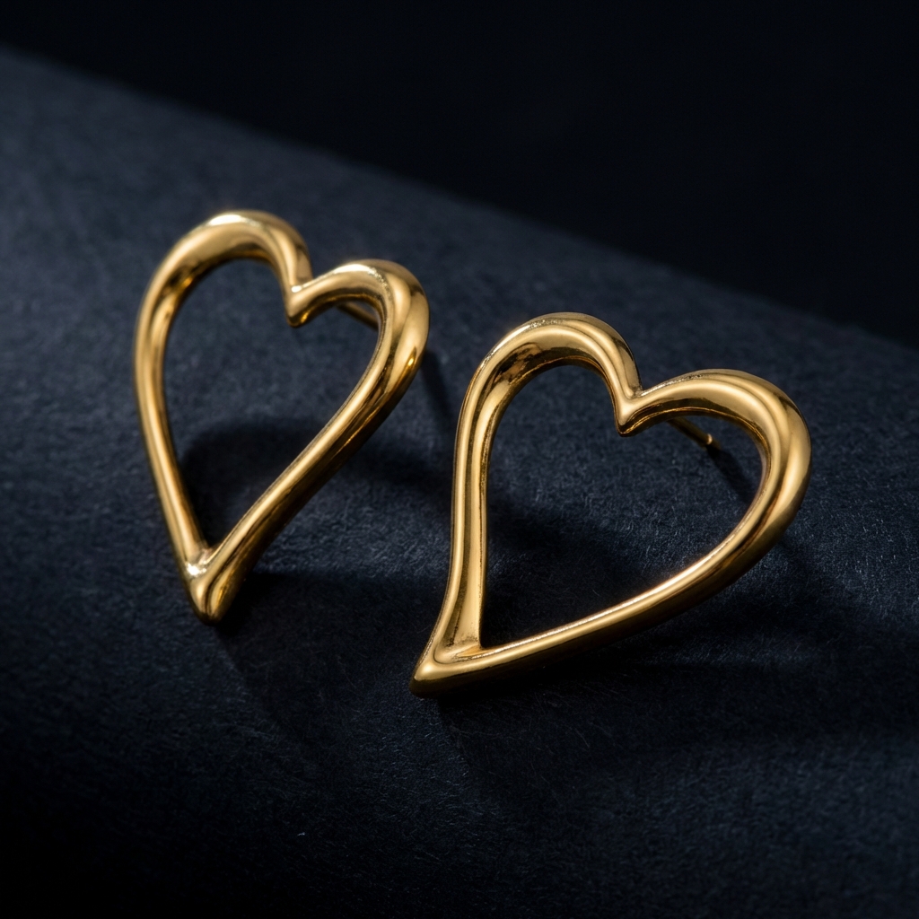 A pair of Love - BØLD Earrings in gold, displayed on a white background, each with a sleek, smooth, and slightly asymmetrical open heart-shaped design. Gate21.eeArmastus - BØLD kõrvarõngad - kuldne