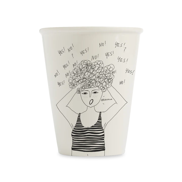 The Overthinking cup is a white Helen B ceramic mug with a black line drawing of a person grabbing their curly hair, wearing a striped vest, surrounded by repeated “YES!” and “NO!” text, and shouting “AAAAAA.”. Gate21.eeÜle mõtlema tass