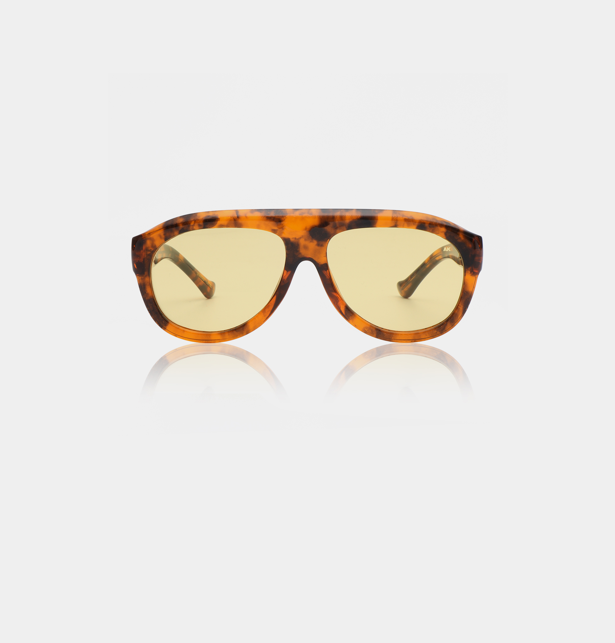 The Rio - Hava sunglasses by A. Kjærbede, featuring a brown and black tortoiseshell frame and yellow-tinted lenses, are displayed on a plain white background. Gate21.eeRio – Havanna