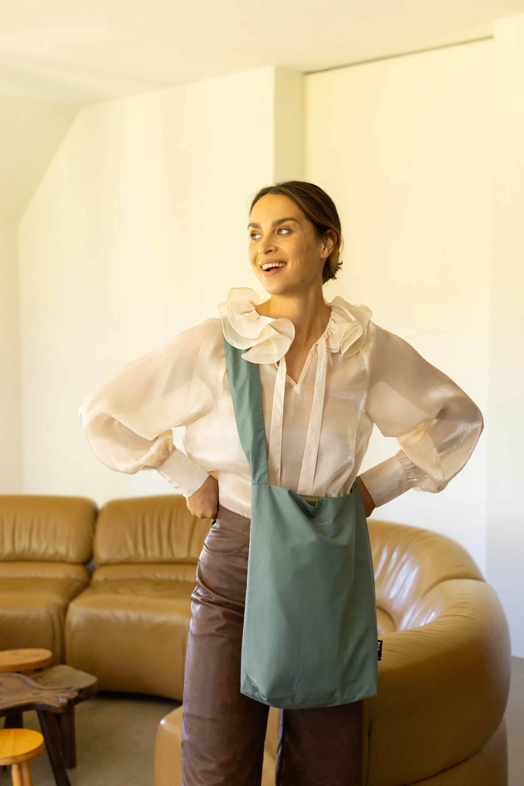 The Tinne+Mia Feel Good bag is made of vegan leather, folded and packed in a beautiful minimalist pouch.